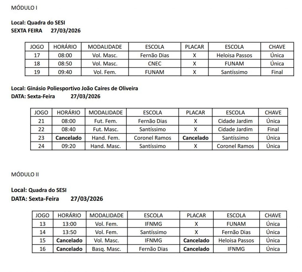 Nesta quinta-feira (26) foram definidos alguns campeões: No Módulo 2, sagrou-se campeão no basquete masculino e no vôlei masculino, o IFNMG; no futsal feminino, a Escola Luiz Balbino, e no handebol feminino (Módulo 1), o Colégio Santíssimo Sacramento.