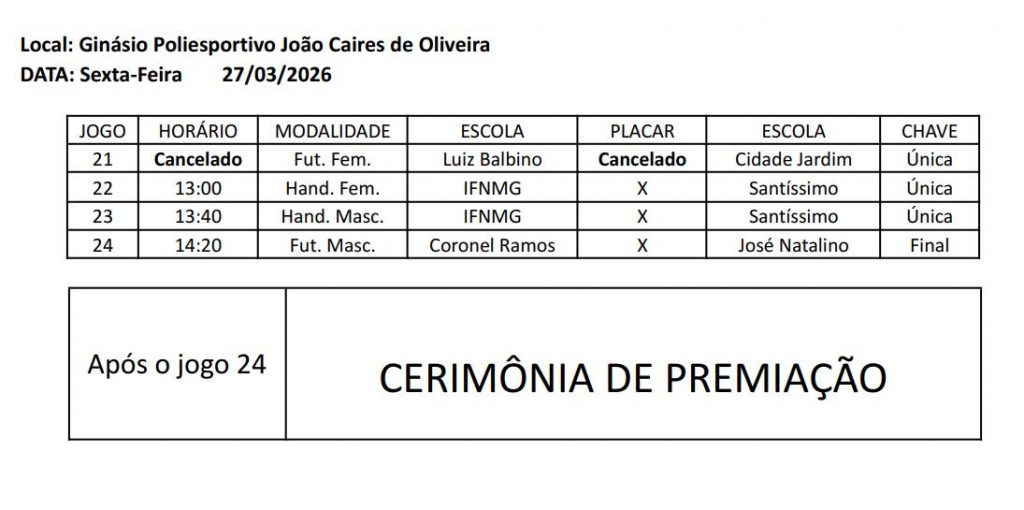 Promovido pela Prefeitura de Pirapora, através da Secretaria de Esporte, Juventude e Cultura (SEJUC), os Jogos Escolares de Pirapora (JOESP 2026), sensação da semana entre os jovens piraporenses, serão encerrados nesta sexta-feira (27/03), com a disputa das finais e a entrega das premiações no Ginásio Poliesportivo João Caires de Oliveira.