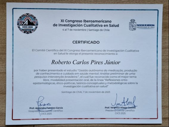 Dois doutorandos do Programa de Pós-graduação em Ciências da Saúde (PPGCS), vinculado à Universidade Estadual de Montes Claros (Unimontes), Leda Antunes Rocha e Roberto Carlos Pires Júnior, apresentaram trabalhos no XI Congresso Ibero-Americano de Pesquisa Qualitativa em Saúde (CIICS) – Conhecimento e experiências em redes de pesquisa. O texto científico de Roberto Carlos foi premiado como melhor apresentação de tema livre do evento, realizado entre os dias 4 e 7 de novembro, na Faculdade de Medicina da Universidade do Chile, na capital Santiago.