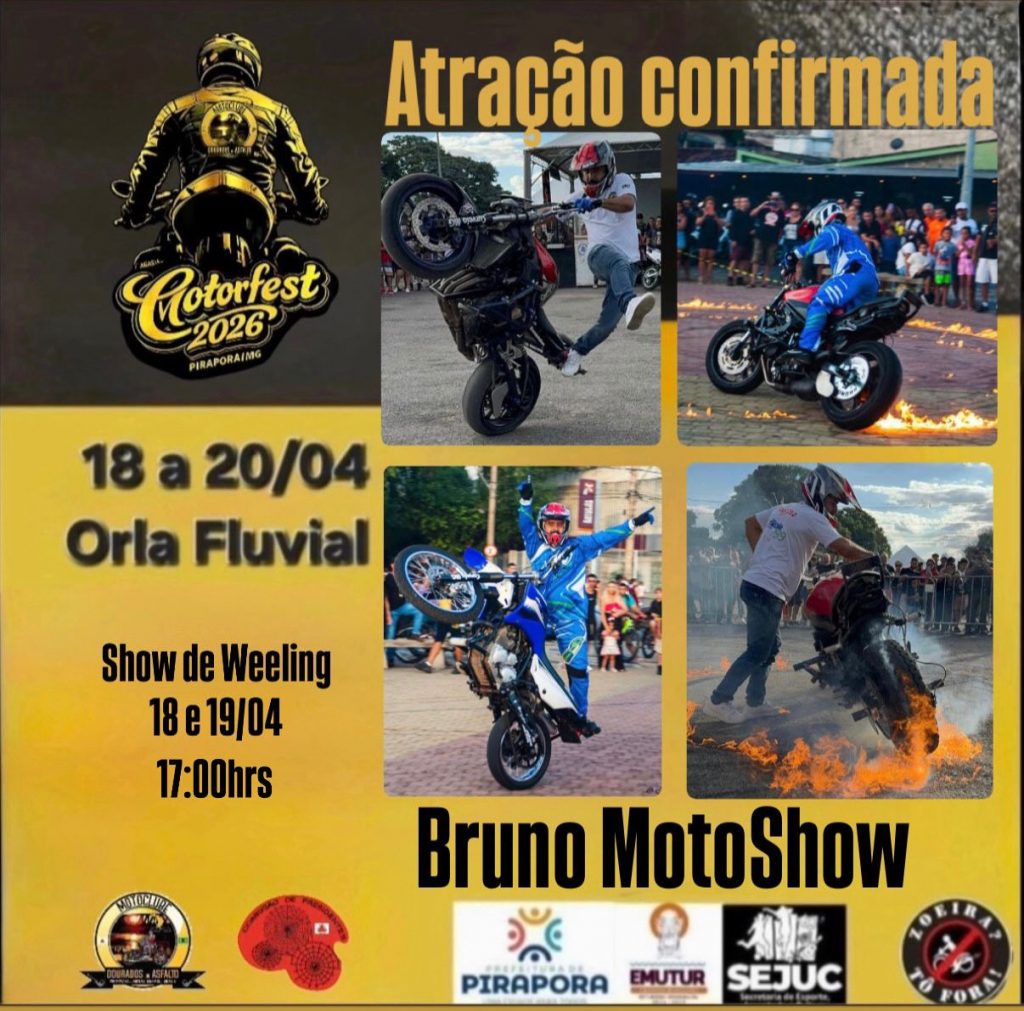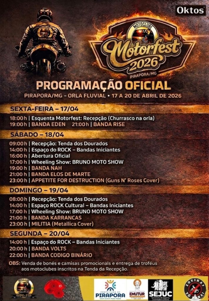 Com o apoio da Prefeitura de Pirapora, através da Secretaria de Esporte, Juventude e Cultura (SEJUC) e EMUTUR, o Motorfest será realizado entre os dias 17 a 20 de abril, na Praça de Eventos da Orla Fluvial. Além do tradicional Encontro Nacional dos Motociclistas, o evento ofertará uma estrutura especial para as diversas atrações culturais, exposições, camping e Praça de Alimentação.